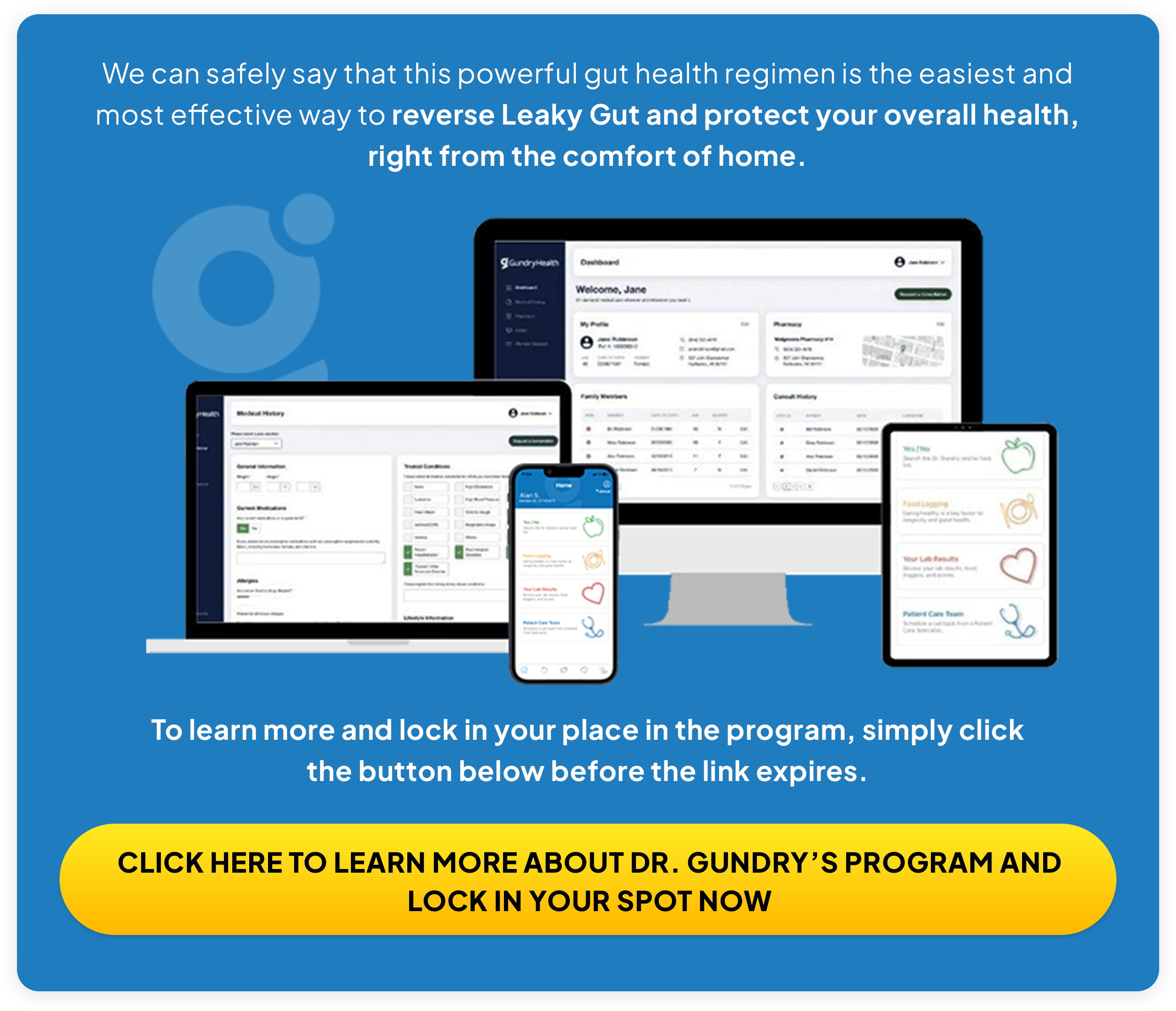 That’s because recently, Dr. Gundry decided to offer remote consultations and treatment — so he could help more people reverse their Leaky Gut and experience the life-changing health benefits that come with a fully restored gut microbiome.